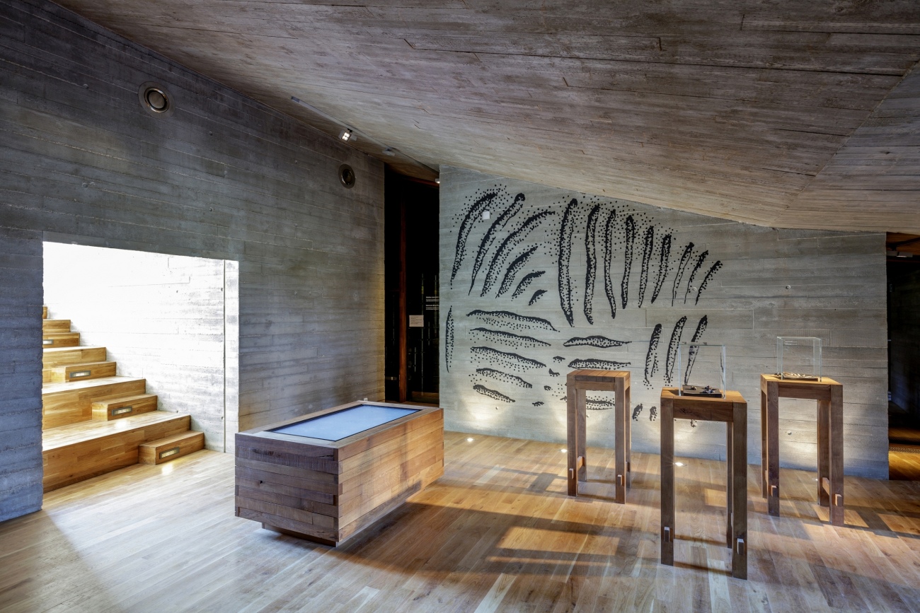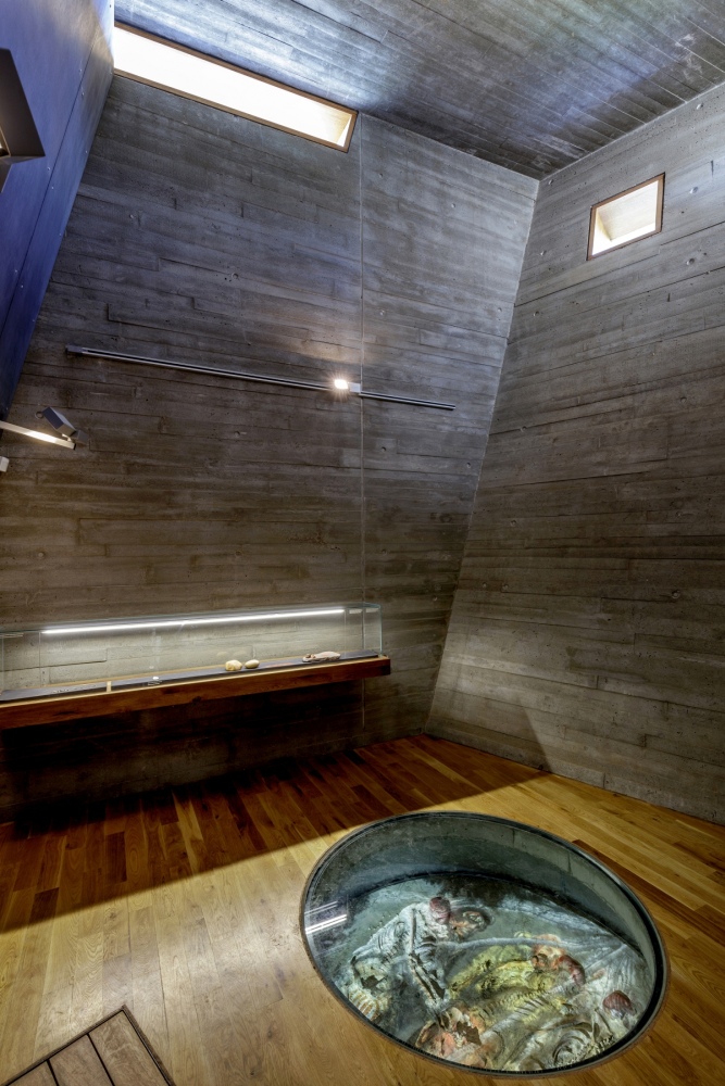 Most of the building is underground and the aforementioned towers provide the only natural light, giving the feeling of entering a prehistoric cave. The archeological site and its artifacts, including skeletons, were integrated into the design of the building, requiring meticulous coordination between the archeologists, designer, contractor and suppliers. The resulting single-floor building includes training premises, a cinema and two galleries for individual exhibits.