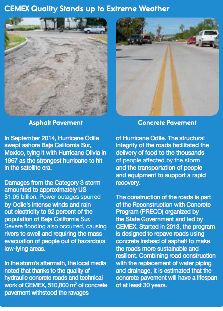 In 2013 Baja California Sur’s State Government began repaving many asphalt roads using concrete as part of the Reconstruction with Concrete Program (PRECO) led by CEMEX. The following year, Hurricane Odile, the strongest hurricane to hit the area since 1967, caused widespread power outages and severe flooding that required mass evacuations. In the storm’s aftermath, the local media noted that thanks to the quality of CEMEX’s hydraulic concrete roads and technical work, some 510,000 m2 of concrete pavement withstood the ravages of the Hurricane. That structural integrity facilitated the delivery of food, people and equipment to support a rapid recovery for the thousands of people affected.